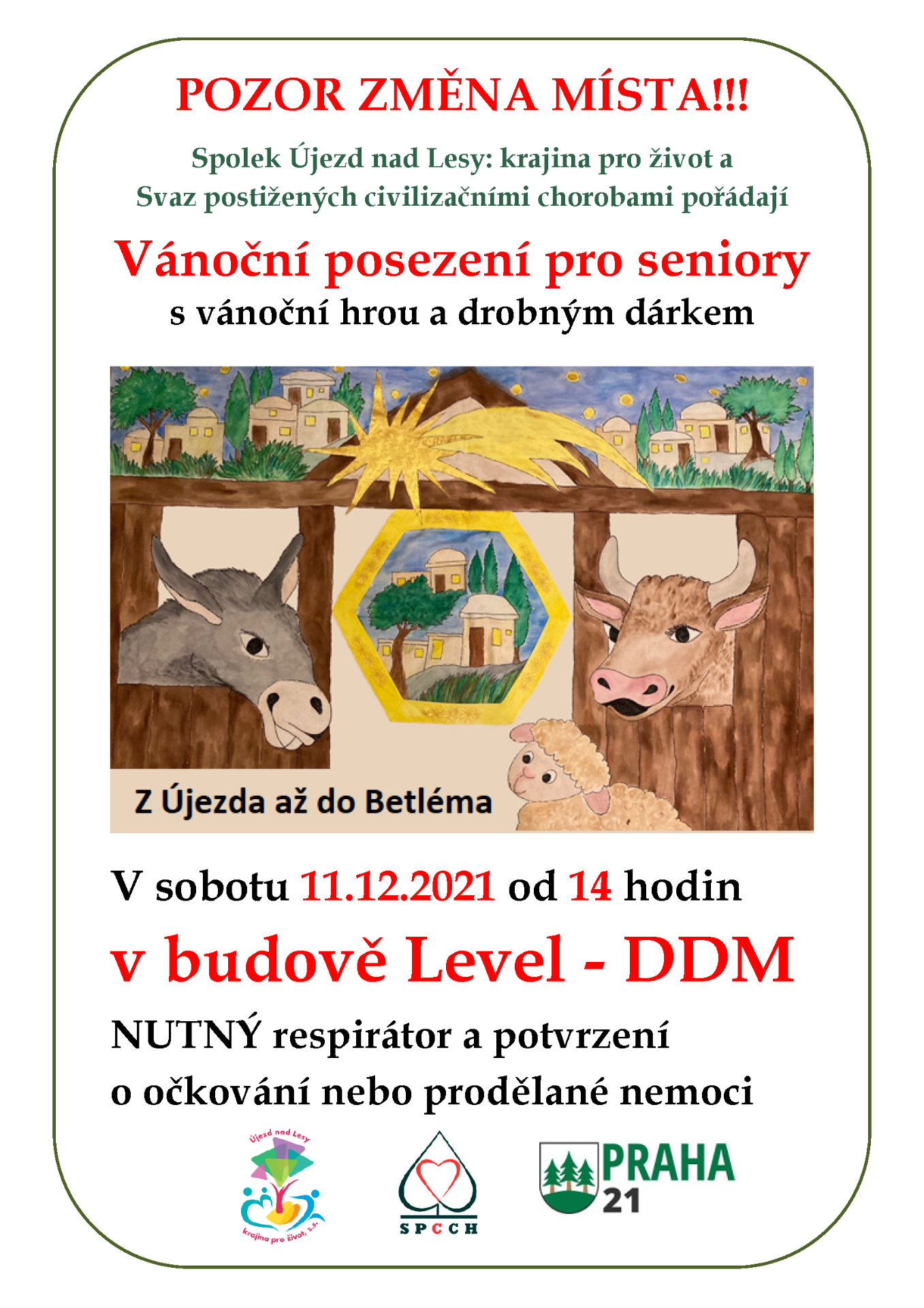 V sobotu 15. prosince uspořádal Svaz postižených civilizačními chorobami a spolek Újezd nad Lesy: krajina pro život v Domě dětí Vánoční posezení pro seniory. Krásné vánoční pásmo koled a básniček předvedly děti z Masarykovy základní školy pod vedením Jaroslavy Pincové.